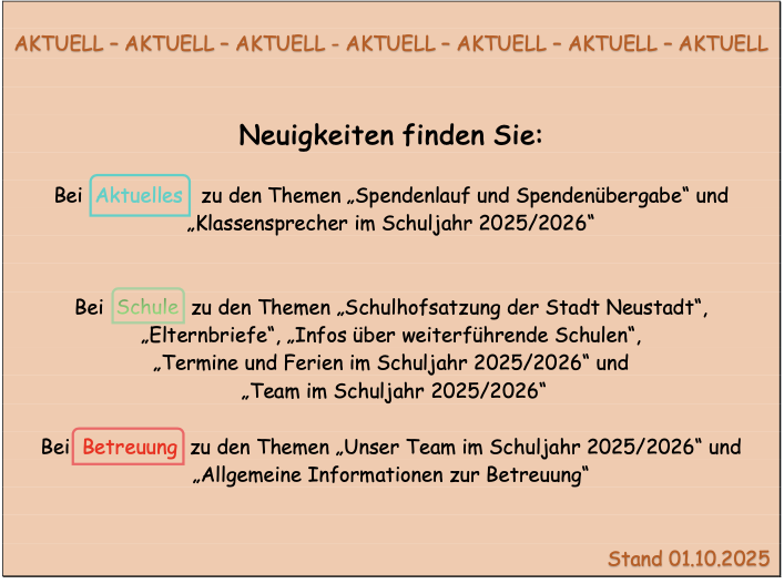Auf unserer Homepage finden Sie Informationen zu unserer Schule, zu unseren pädagogischen und unterrichtlichen Schwerpunkten, zu Schulveranstaltungen und Terminen, zu unserer Schülerbücherei, zu unserer Elternarbeit, die Elternbriefe, Informationen über die Betreuende Grundschule und zu unserem Förderverein.