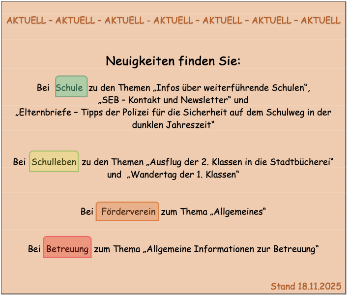 Auf unserer Homepage finden Sie Informationen zu unserer Schule, zu unseren pädagogischen und unterrichtlichen Schwerpunkten, zu Schulveranstaltungen und Terminen, zu unserer Schülerbücherei, zu unserer Elternarbeit, die Elternbriefe, Informationen über die Betreuende Grundschule und zu unserem Förderverein.