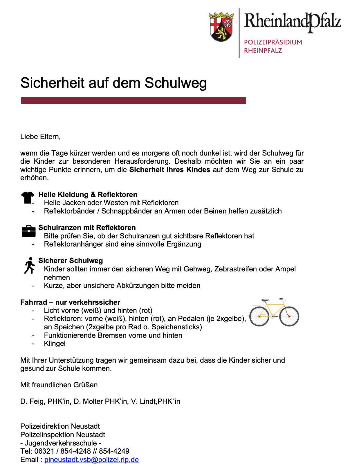 Hier ein Schreiben der Polizei mit wichtigen Sicherheitstipps für den Schulweg: