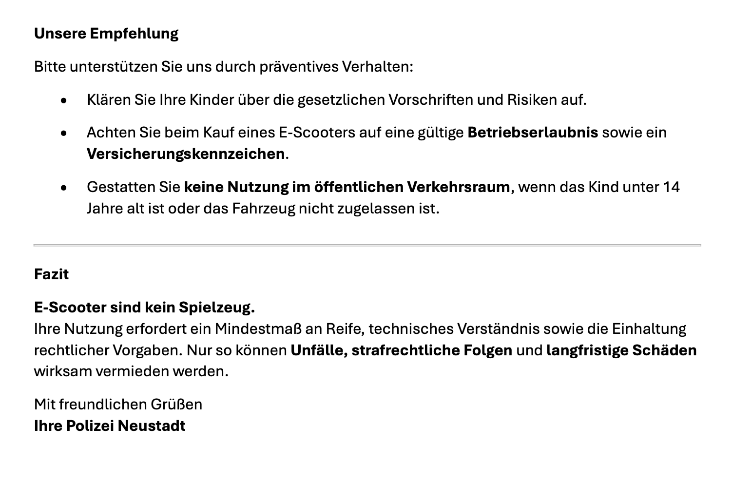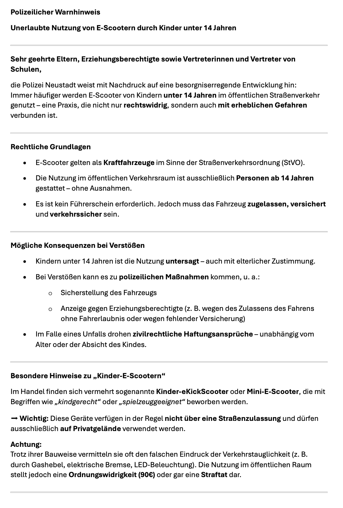Außerdem möchte Sie die Polizei Neustadt mit diesem Schreiben auf eine aktuell zunehmend beobachtete Problematik im öffentlichen Verkehrsraum hinweisen: